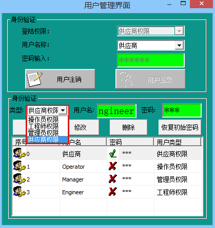 系統(tǒng)快捷方式進入用戶權限登錄界面。如圖所示。根據(jù)需求客戶可以添加創(chuàng)建管理員、工程師以及操作員身份權限用戶登錄。