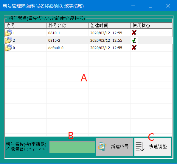 A. 料號(hào)管理:操作產(chǎn)品配方相關(guān)參數(shù)。詳情參考第 3.7.1 章“料號(hào)管理界面”;