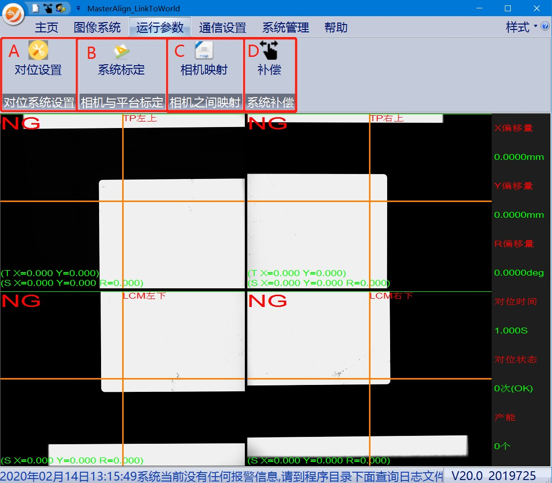 在“運(yùn)行參數(shù)”->點(diǎn)擊“對(duì)位設(shè)置”彈出對(duì)位系統(tǒng)界面,如圖所示: