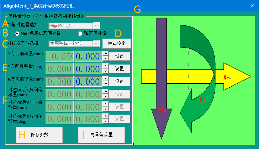 F. 對(duì)位 OK 后 XYR 方向偏移量:即對(duì)位 OK 后,可以根據(jù)產(chǎn)品最終放置的位置設(shè)定補(bǔ)償?shù)?XYR,方向可以參考 D 圖;