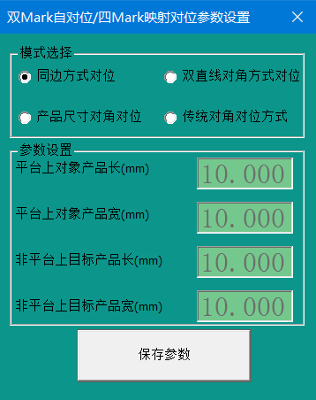 c. 產(chǎn)品尺寸對(duì)角對(duì)位:產(chǎn)品對(duì)位基準(zhǔn)為兩個(gè)互為對(duì)角的靶標(biāo) Mark,需要在下方“參數(shù)設(shè)置”區(qū)域?qū)懭氘a(chǎn)品在長(zhǎng)寬數(shù)值,長(zhǎng)方向?yàn)橄鄼C(jī)的 X 方向的產(chǎn)品長(zhǎng)度方向。