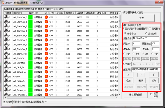 啟動用戶手動編輯協(xié)議:通過勾選“啟動用戶手動編輯協(xié)議”后就可以修改命令協(xié)議和數(shù)據(jù)協(xié)議的關(guān)鍵字、數(shù)據(jù)地址、功能詳細(xì)說明。也可以操作對應(yīng)地址讀取寄存器數(shù)值,復(fù)位寄存器數(shù)值,以及復(fù)位所有寄存器數(shù)值,退出界面時,需要將 “啟動用戶手動編輯協(xié)議”的狀態(tài)置為不勾選;