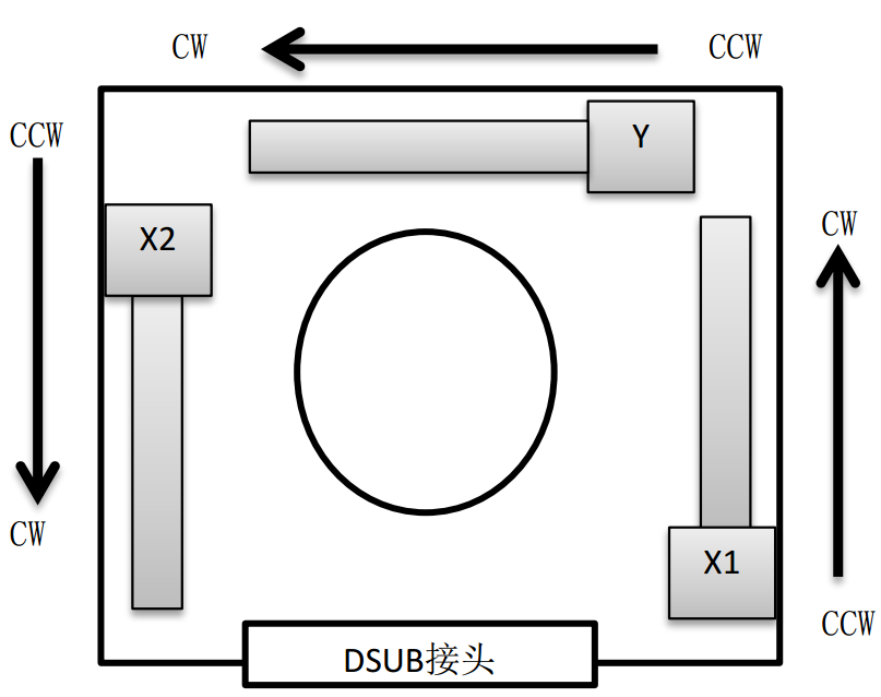 XXY各軸運動方向圖所示,X1軸方向往上為正方向運動,往下則為負方向;X2軸往下為正方向運動,往上則為負方向運動;Y軸往左為正方向運動,往右則為負方向運動。按照此方法,等效XYR模型圖(R軸表示旋轉(zhuǎn)軸)如圖1所示,由于平臺的行程有限(±3mm/±2度),所以我們在控制平臺回零的時候,需要特別注意,尤其是對X1軸和X2軸的控制方式,建議采用以下方式進行控制: