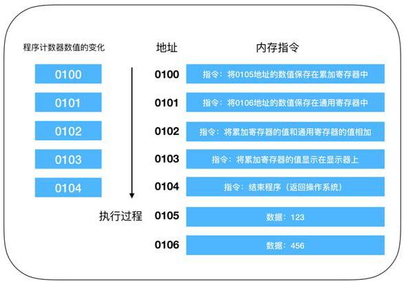 這是一段進(jìn)行相加的操作,程序啟動(dòng),在經(jīng)過(guò)編譯解析后會(huì)由操作系統(tǒng)把硬盤(pán)中的程序復(fù)制到內(nèi)存中,示例中的程序是將 123 和 456 執(zhí)行相加操作,并將結(jié)果輸出到顯示器上。由于使用機(jī)器語(yǔ)言難以描述,所以這是經(jīng)過(guò)翻譯后的結(jié)果,實(shí)際上每個(gè)指令和數(shù)據(jù)都可能分布在不同的地址上,但為了方便說(shuō)明,把組成一條指令的內(nèi)存和數(shù)據(jù)放在了一個(gè)內(nèi)存地址上。