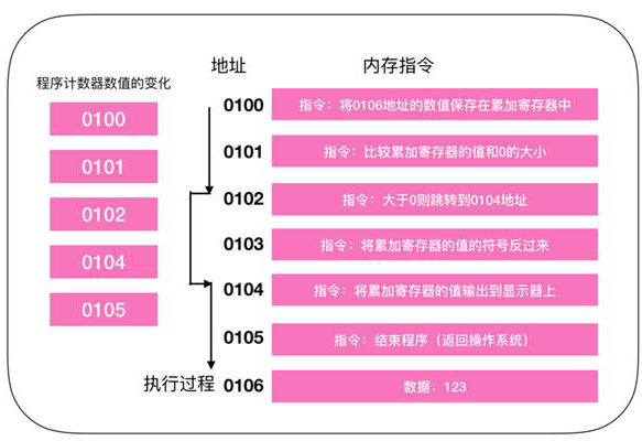 地址 0100 是程序運(yùn)行的起始位置。Windows 等操作系統(tǒng)把程序從硬盤(pán)復(fù)制到內(nèi)存后,會(huì)將程序計(jì)數(shù)器作為設(shè)定為起始位置 0100,然后執(zhí)行程序,每執(zhí)行一條指令后,程序計(jì)數(shù)器的數(shù)值會(huì)增加1(或者直接指向下一條指令的地址),然后,CPU 就會(huì)根據(jù)程序計(jì)數(shù)器的數(shù)值,從內(nèi)存中讀取命令并執(zhí)行,也就是說(shuō),程序計(jì)數(shù)器控制著程序的流程。