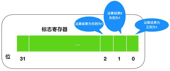 CPU 在進(jìn)行運(yùn)算時(shí),標(biāo)志寄存器的數(shù)值會(huì)根據(jù)當(dāng)前運(yùn)算的結(jié)果自動(dòng)設(shè)定,運(yùn)算結(jié)果的正、負(fù)和零三種狀態(tài)由標(biāo)志寄存器的三個(gè)位表示。標(biāo)志寄存器的第一個(gè)字節(jié)位、第二個(gè)字節(jié)位、第三個(gè)字節(jié)位各自的結(jié)果都為1時(shí),分別代表著正數(shù)、零和負(fù)數(shù)。