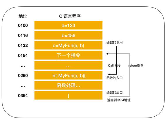 圖中將變量 a 和 b 分別賦值為 123 和 456 ,調(diào)用 MyFun(a,b) 方法,進(jìn)行指令跳轉(zhuǎn)。圖中的地址是將 C 語(yǔ)言編譯成機(jī)器語(yǔ)言后運(yùn)行時(shí)的地址,由于1行 C 程序在編譯后通常會(huì)變?yōu)槎嘈袡C(jī)器語(yǔ)言,所以圖中的地址是分散的。在執(zhí)行完 MyFun(a,b)指令后,程序會(huì)返回到 MyFun(a,b) 的下一條指令,CPU 繼續(xù)執(zhí)行下面的指令。