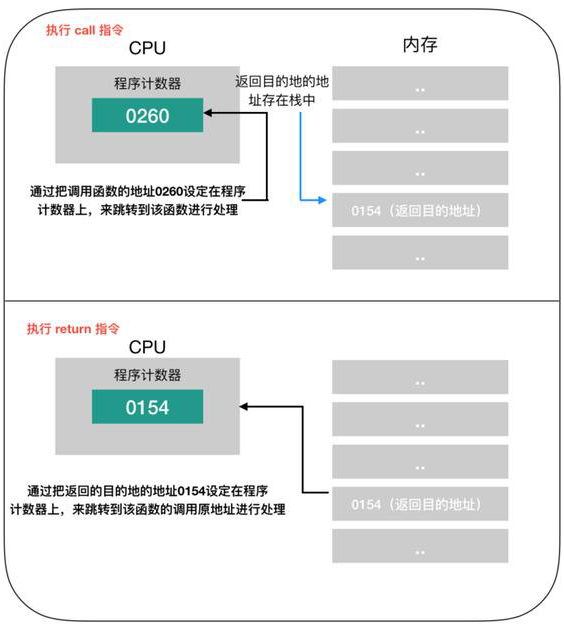 在一些高級(jí)語(yǔ)言的條件或者循環(huán)語(yǔ)句中,函數(shù)調(diào)用的處理會(huì)轉(zhuǎn)換成 call 指令,函數(shù)結(jié)束后的處理則會(huì)轉(zhuǎn)換成 return 指令。