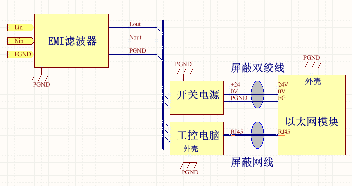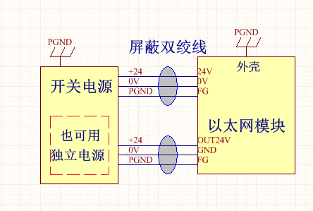 3. 給以太網(wǎng)模塊的直流電源24V/0V,用帶屏蔽的雙絞線,屏蔽層兩端分別接開關(guān)電源的PGND 和 模塊的FG。雙絞線線徑采用1.0~1.5平方的線。