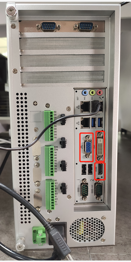 此次測試采用的工控的型號為:SC-W-7010G-2C-I5,工控機(jī)顯示接口有:VGA, DVI,HDMI這個(gè)三種,工控機(jī)支持三個(gè)顯示器同時(shí)連接。目前測試采用顯示器的接口是VGA和HDMI。如圖: