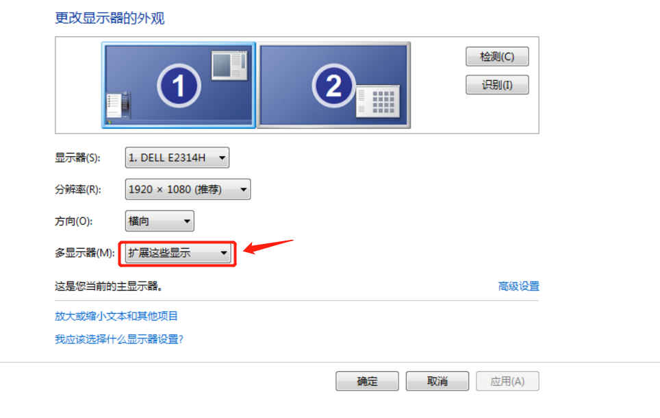 b:多顯示器的選項(xiàng)中,選擇擴(kuò)展這些顯示。