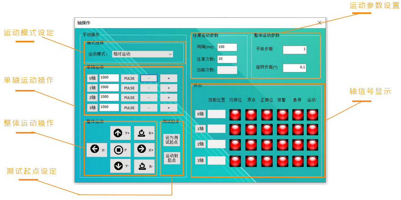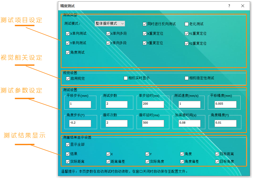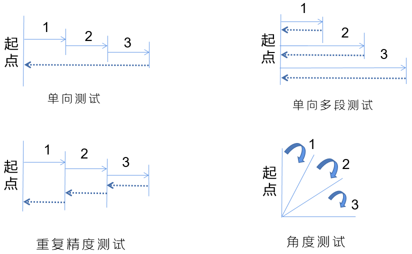 相機標定后即可建立圖像坐標與物理坐標的關系。測試時系統(tǒng)控制平臺進行多種方式的運動,視覺系統(tǒng)記錄平臺每次運動前后Mark點的坐標及角度,并以此來計算平臺實際的運動量和運動偏差。