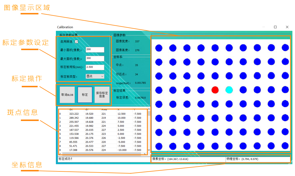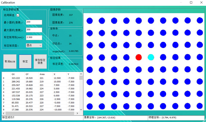 系統(tǒng)使用原點標定板進行標定,先用BLOB工具對圓點進行篩選和定位,然后以圖像最中心的圓點為物理坐標原點,根據(jù)標定板的點間距計算每個圓點中心的物理坐標。