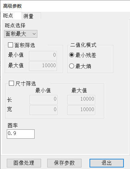 斑點分析的前提是把斑點與背景分割開來。一般情況下,默認使用【最小殘差】即可處理絕大部分的圖像。當圖像明暗不明顯,或斑點與背景對比不明顯時,使用【最小殘差】的效果將受到影響,這時使用【最大熵】會得到較理想的效果。