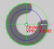 該參數(shù)表示參與擬合圓的有效點數(shù)量占總測量路徑數(shù)量的百分比。由于邊緣殘缺或部分邊緣點被剔除等情況,使得參與擬合圓的邊緣點數(shù)目減少,但不能低于該參數(shù)值,否則測量失敗。下圖中,有效點比例VPP:0.8182
