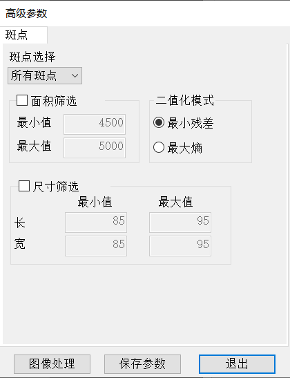 斑點分析的前提是把斑點與背景分割開來。一般情況下,默認(rèn)使用【最小殘差】即可處理絕大部分的圖像。當(dāng)圖像明暗不明顯,或斑點與背景對比不明顯時,使用【最小殘差】的效果將受到影響,這時使用【最大熵】會得到較理想的效果。