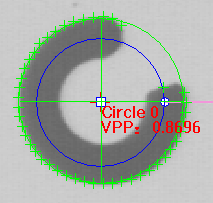 該參數(shù)表示參與擬合圓的有效點(diǎn)數(shù)量占總測(cè)量路徑數(shù)量的百分比。由于邊緣殘缺或部分邊緣點(diǎn)被剔除等情況,使得參與擬合圓的邊緣點(diǎn)數(shù)目減少,但不能低于該參數(shù)值,否則測(cè)量失敗。下圖中,有效點(diǎn)比例VPP:0.8182