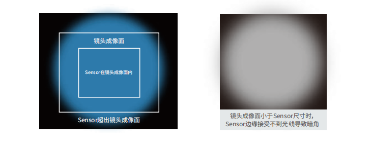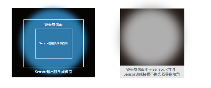 鏡頭最大成像面指經(jīng)過鏡頭后所成像的最大范圍,當(dāng)其小于圖像傳感器尺寸時,將出現(xiàn)暗角或黑邊。