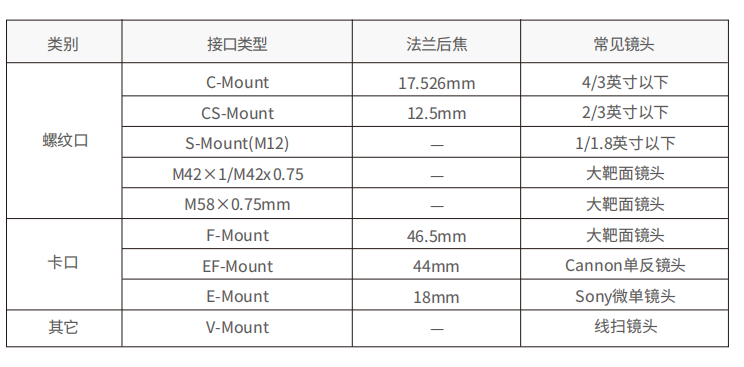 相機接口為相機與鏡頭的連接方式,保證鏡頭安裝緊固不松動和鏡頭所需后焦。鏡頭法蘭口即鏡頭安裝承靠面與成像面的距離稱為法蘭后焦,不同鏡頭的法蘭后焦不同,影響鏡頭對焦距離、清晰度。