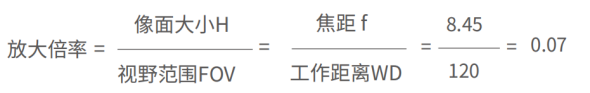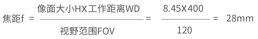 例:如選用500M相機,像素數(shù)2448×2048,像元大小3.45um,要求工作距離在400mm以內(nèi),檢測范圍120×100mm,則鏡頭焦距為多少?