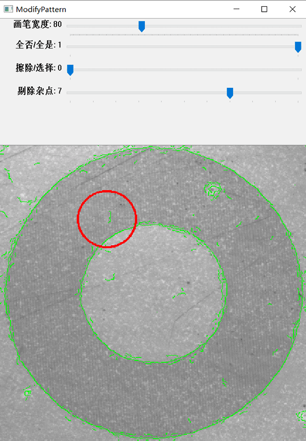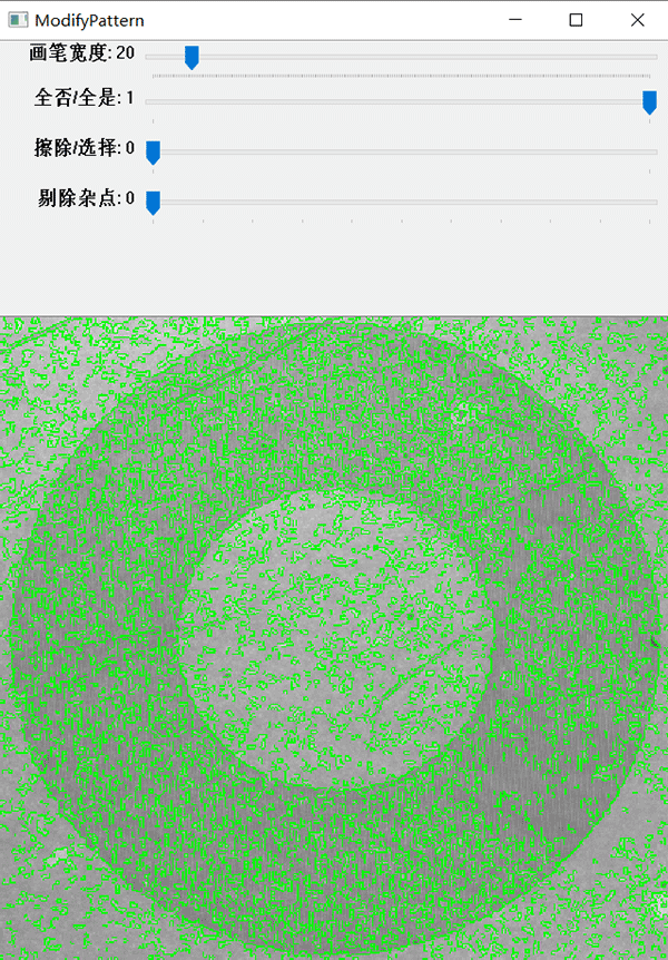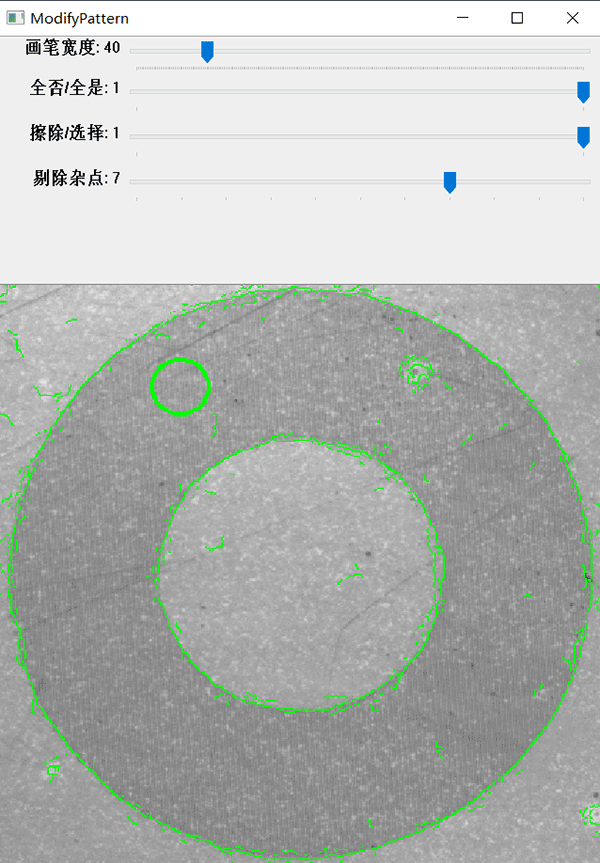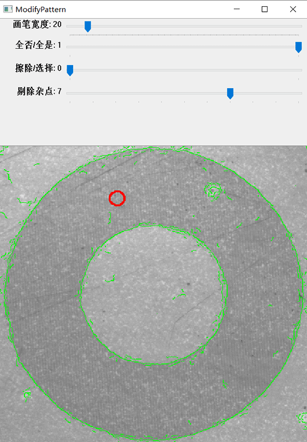 當(dāng)圖像的質(zhì)量較差時(shí),邊緣模糊產(chǎn)生大量的雜點(diǎn);從而增加了搜索的時(shí)間,同時(shí)影響了搜索的準(zhǔn)確性。通過調(diào)整【剔除雜點(diǎn)】去除大部分的干擾點(diǎn),優(yōu)化了模板的輪廓信息。