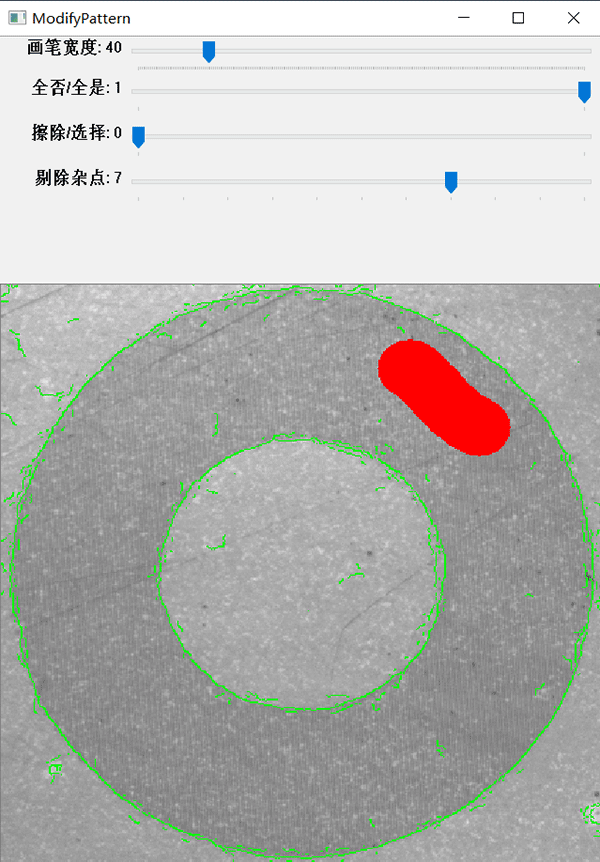 如模板存在干擾的邊緣特征點(diǎn),可以對(duì)模板輪廓進(jìn)行修改優(yōu)化,從而改善輪廓匹配搜索目標(biāo)的性能。算法在提取邊緣特征點(diǎn)時(shí),將不再考慮被涂的紅色區(qū)域內(nèi)的特征點(diǎn)。