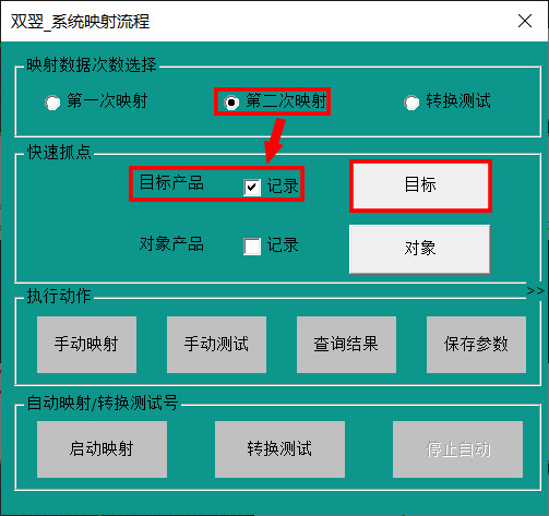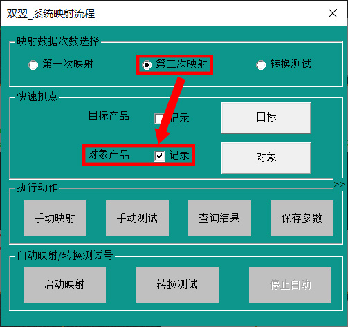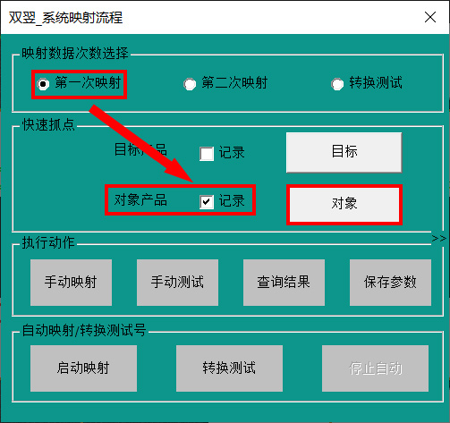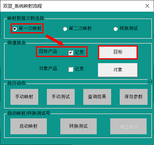 1) 系統(tǒng)全體停止,將TP搬運(yùn)到目標(biāo)相機(jī)下,打開映射界面,勾選第一次映射,再勾選目標(biāo)產(chǎn)品“記錄”,點(diǎn)擊“目標(biāo)”按鈕,系統(tǒng)會(huì)抓取Mark點(diǎn)的坐標(biāo)。