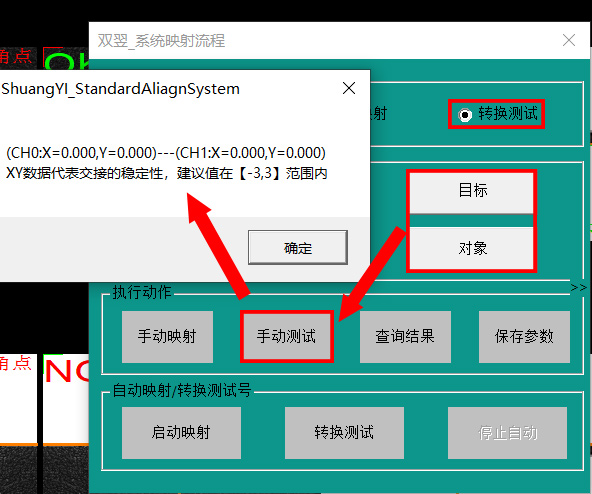 6) 勾選轉(zhuǎn)換測(cè)試,再做第三次交接,步驟同上,抓點(diǎn)OK后點(diǎn)擊手動(dòng)測(cè)試。CH數(shù)據(jù)需要在【-3~3】范圍內(nèi)才算映射合格。代表產(chǎn)品交接穩(wěn)定,否則需要檢查抓點(diǎn)問題和機(jī)構(gòu)交接的穩(wěn)定性問題。