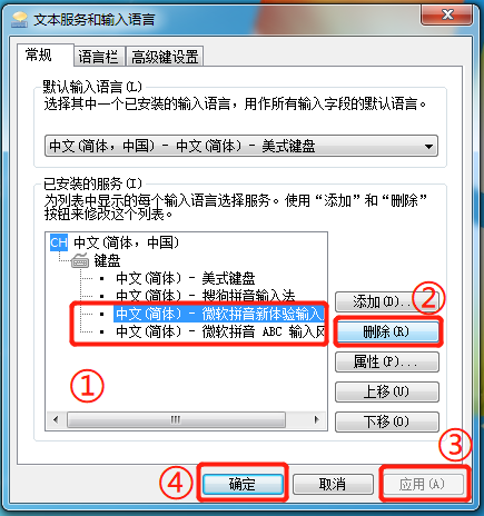 選中不需要的輸入法,點擊“刪除”→“應(yīng)用”→“確定”