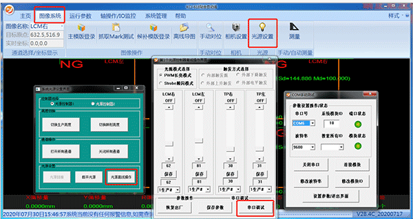 →將光源連接到光源控制器上,點擊圖中⑧所在區(qū)域中的按鈕及滑塊控制光源開關(guān)及亮滅,確認(rèn)光源控制器無異常,如果異常請找技術(shù)確認(rèn)問題并解決。