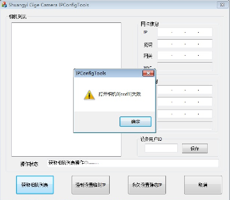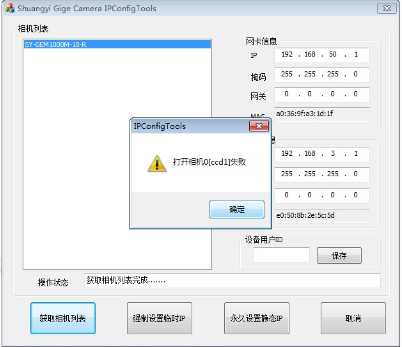 3)點擊“獲取相機(jī)列表”,會彈出打開相機(jī)失敗以及請確認(rèn)網(wǎng)卡IP地址和相機(jī)地址是否匹配。