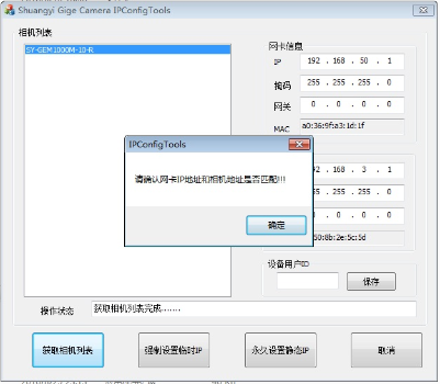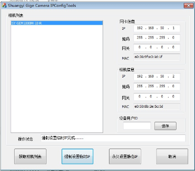 5)填寫相機(jī)IP地址(默認(rèn)192.168.50.2為CCD0,192.168.51.2為CCD1,以此類推),點擊強(qiáng)制設(shè)置臨時IP,系統(tǒng)會顯示強(qiáng)制設(shè)置臨時IP完成……