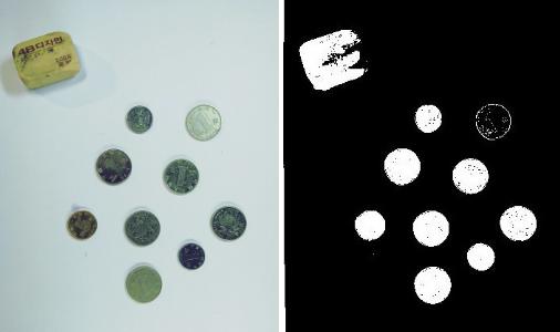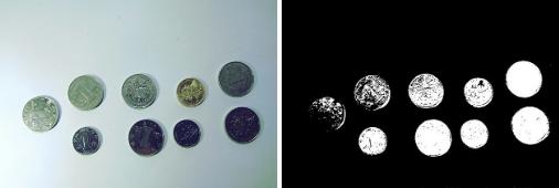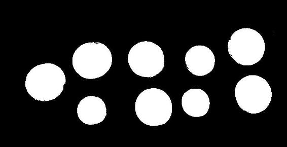 之后僅對(duì)既有物體又有背景的塊進(jìn)行自動(dòng)閾值處理、二值化、填充孔洞,可以得到圖6的結(jié)果,可以看到每個(gè)硬幣都被很好的分割出來(lái):