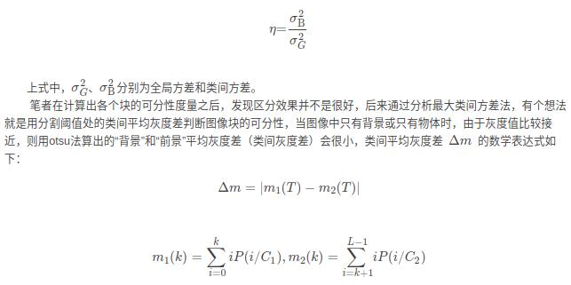 筆者在計(jì)算出各個(gè)塊的可分性度量之后,發(fā)現(xiàn)區(qū)分效果并不是很好,后來(lái)通過(guò)分析最大類(lèi)間方差法,有個(gè)想法就是用分割閾值處的類(lèi)間平均灰度差判斷圖像塊的可分性,當(dāng)圖像中只有背景或只有物體時(shí),由于灰度值比較接近,則用otsu法算出的“背景”和“前景”平均灰度差(類(lèi)間灰度差)會(huì)很小。