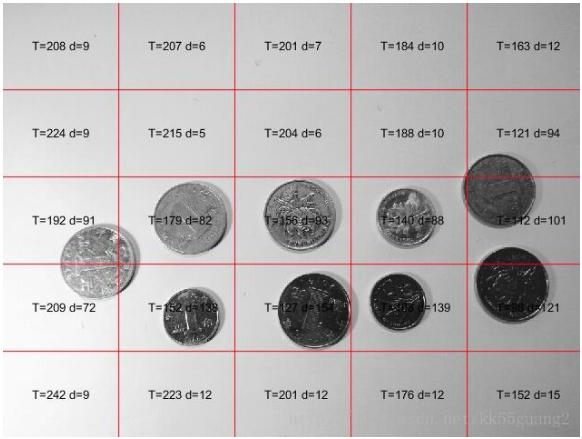 圖5為分塊結(jié)果,示例中分塊與硬幣大小相當(dāng),分完塊之后就可以按塊進(jìn)行全局閾值法(這里采用常用的最大類(lèi)間方差法,otsu法)處理了,但是需要注意的是有的塊中只有背景,這個(gè)時(shí)候需要進(jìn)行判斷,排除對(duì)這種塊的處理。