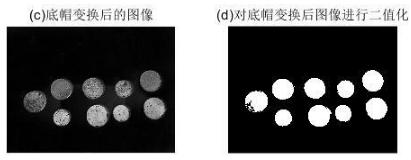 由于原圖是背景亮,前景暗,對(duì)原圖進(jìn)行底帽變換以解決光照不均勻的問(wèn)題,這里先給出處理結(jié)果,如下圖,可以看到底帽變換后的圖像刪除了大部分非均勻背景,最后閾值處理后,左邊的硬幣被分割出來(lái),有少量殘缺,但是影響不大,后續(xù)可以通過(guò)形態(tài)學(xué)的其他處理將殘缺補(bǔ)齊。
