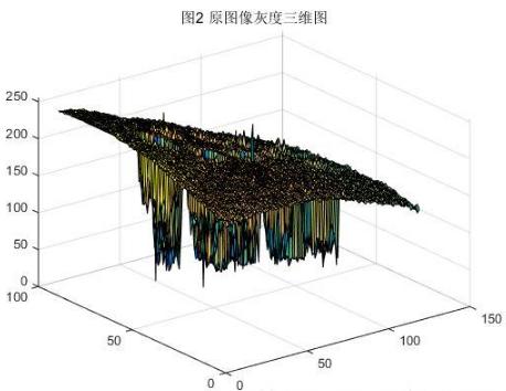 圖2為原圖灰度三維圖,上方彎曲的走勢(shì)顯示了圖像各部分光照不均勻造成的背景灰度不均現(xiàn)象,其中凹陷對(duì)應(yīng)圖像中灰度值比較小的區(qū)域,也就是圖像中的硬幣。