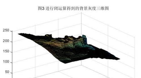 通過(guò)選取大于硬幣大小的合適結(jié)構(gòu)元,可以看成一個(gè)球體在灰度曲面上滾動(dòng),球體下表面的軌跡構(gòu)成閉運(yùn)算的曲面,如圖3所示,原圖中的凹陷都被填上,可以近似代表不均勻的背景。閉運(yùn)算完之后再減去原圖像即可得到背景近似均勻的圖像,如圖4所示,對(duì)應(yīng)的灰度圖可以看圖1(c),可以看到不均勻的背景被大致去除,這將十分有助于后面的閾值分割。