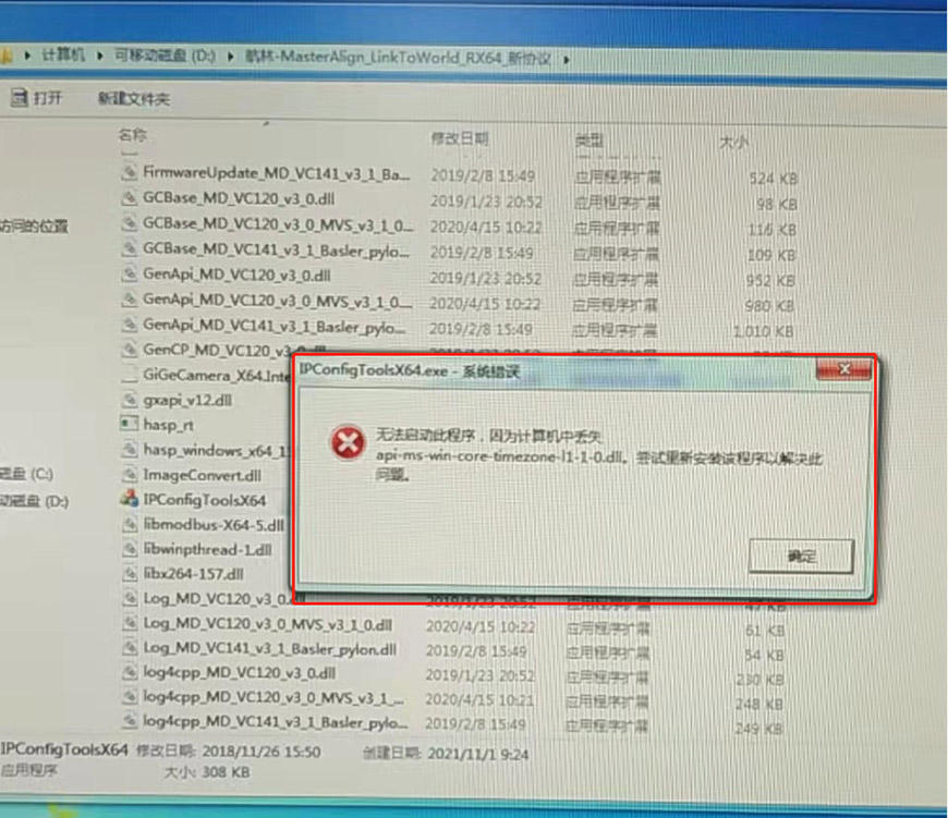 在新工控機或新裝的系統(tǒng)中安裝好軟件環(huán)境包后打開軟件還提示計算機丟失api-ms-win-core-timezone-l1-1-0.dll文件錯誤(如下圖所示),可以嘗試下面三種解決方法。