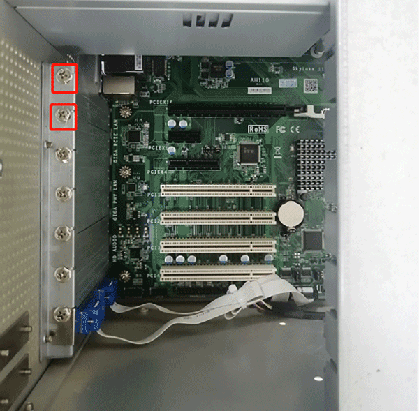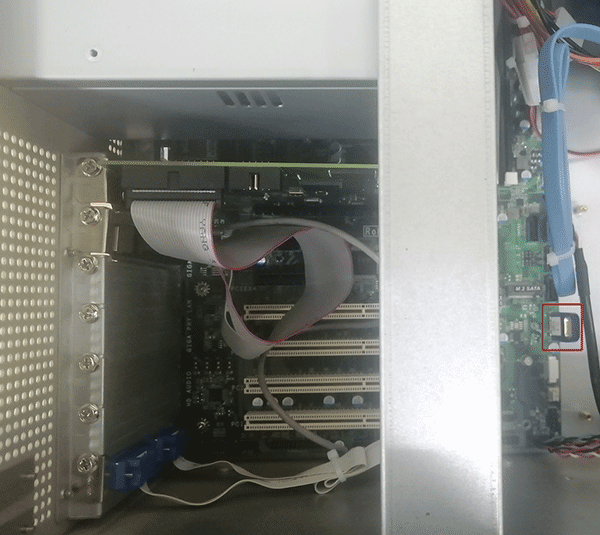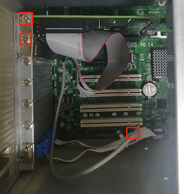 →將激光打標(biāo)卡插入PCIe插槽,鎖螺絲固定好,將圖中激光打標(biāo)卡上排線插入主板USB針腳上