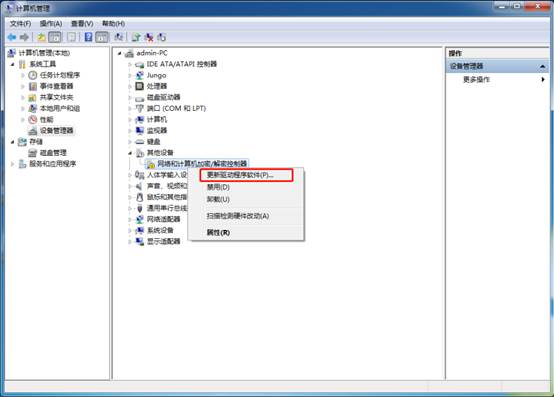 選擇計(jì)算機(jī)右擊—管理—計(jì)算機(jī)管理(本地)—設(shè)備管理器—其他設(shè)備—網(wǎng)絡(luò)和計(jì)算機(jī)加密/解密控制器—更新驅(qū)動(dòng)程序軟件