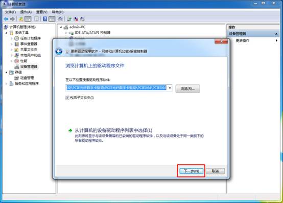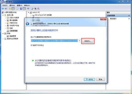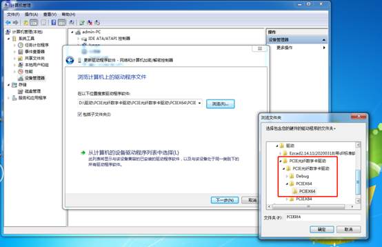點(diǎn)擊瀏覽查找驅(qū)動(dòng),選中驅(qū)動(dòng)路勁“D:\驅(qū)動(dòng)\PCIE光纖數(shù)字卡驅(qū)動(dòng)\PCIE光纖數(shù)字卡驅(qū)動(dòng)\PCIEX64\PCIEX64”后確定,
