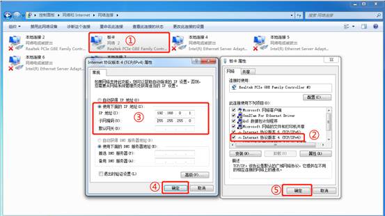 →右鍵點(diǎn)開“運(yùn)動(dòng)控制卡”的網(wǎng)絡(luò)屬性,按以下順序修改運(yùn)動(dòng)控制卡的IP地址