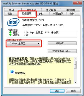 →將“鏈接速度”選項(xiàng)卡中的“速度和雙工”屬性,修改為“1.0 Gbps全雙工”