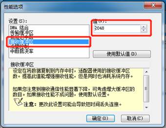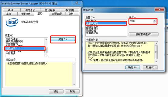 →點(diǎn)擊“高級(jí)”選項(xiàng)卡中的“性能選項(xiàng)”,點(diǎn)擊屬性,將“傳輸緩沖區(qū)”的值修改為最大值,圖中最大值為“2048”