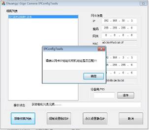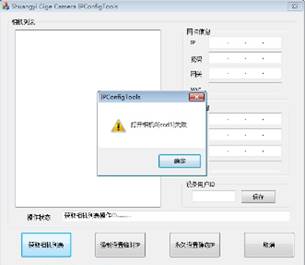 3) 點(diǎn)擊“獲取相機(jī)列表”,會(huì)彈出打開相機(jī)失敗以及請(qǐng)確認(rèn)網(wǎng)卡IP地址和相機(jī)地址是否匹配。