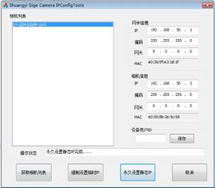 5) 填寫相機(jī)IP地址(默認(rèn)192.168.50.2為CCD0,192.168.51.2為CCD1,以此類推),點(diǎn)擊強(qiáng)制設(shè)置臨時(shí)IP,系統(tǒng)會(huì)顯示強(qiáng)制設(shè)置臨時(shí)IP完成……