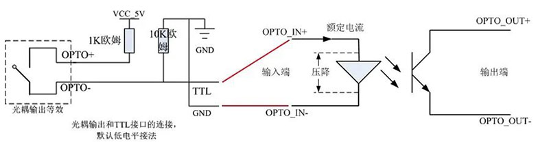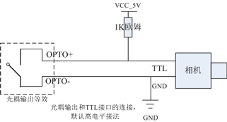 可連接光耦輸入接口的相機(jī),將輸出端的光耦信號(hào)通過上拉電阻或下拉電阻,轉(zhuǎn)為TTL信號(hào)后,再觸發(fā)輸入端的光耦合電路。