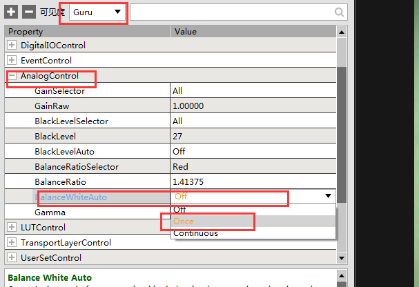 選擇Guru模式,在AnalogControl選項(xiàng)下BalanceWhiteAuto下拉點(diǎn)取Once后采集,自動(dòng)跳成off,