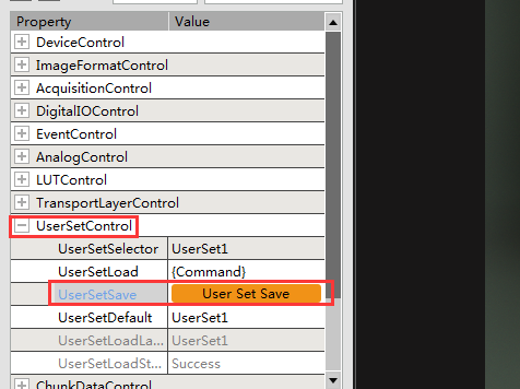 點(diǎn)擊UserSetControl選項(xiàng)下UserSetSave選項(xiàng)保存參數(shù)